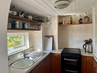 Built in kitchen units, shelving and tongue and groove ceiling.