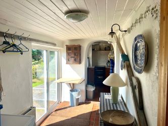 Beautiful bright porch with sliding door access, tongue and groove slated ceiling, built in storage and archway to kitchen.